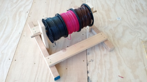 Before starting to run 12v wires for lights, etc, I found it helpful to fashion up a holder for the spools I was using (mostly 14 AWG for lights, fans, etc). Note: When you go to buy wire, just buy way more than you think you'll need, cause you're probably going to use it, and you'll get a better price on it doing so.