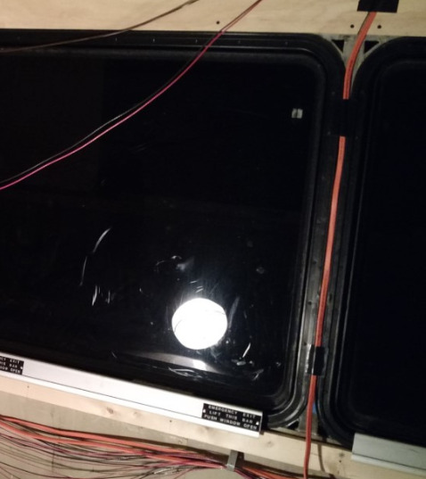 Fan wires are held in place using a piece of solid wire bridging the hole in the insulation, until a time when the ceiling hole is cut in the exterior aluminum skin.