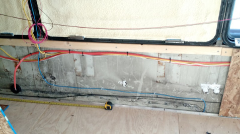 To avoid some sort of conduit, and keep the run as short as possible, the thicker 10 AWG wire for the front air conditioner was run between the aluminum window frames in front of the sink and up into the ceiling. This is later covered up with wood.