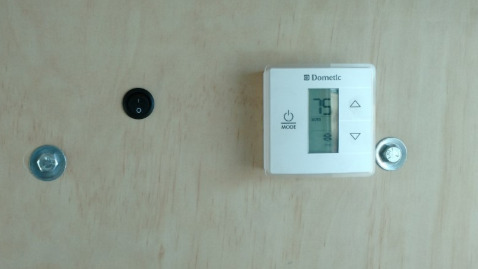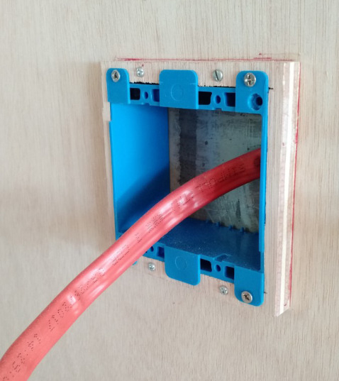 A light switch and thermostat needed to be mounted on the front side of the master bedroom wall, consisting of a single plywood board. However, it's pretty tough to hide wires inside a piece plywood.