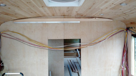A lot of wires needed to cross from one side of the bus to the other, so they were ran above the 2x3 board used to stiffen the wall and hang the pocket door inside the first dividing wall (shown better in photos to follow).