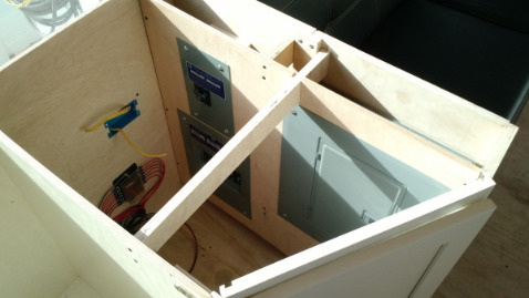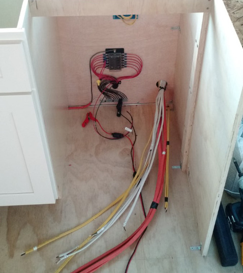 Inside the end kitchen cabinet, the AC breaker panels were installed, with the 12v DC fuse panel in the back of the