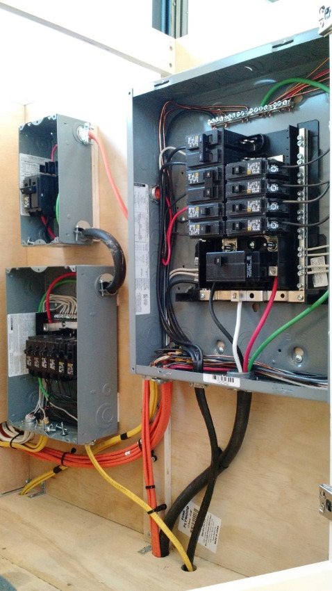 On the left, at the top, is simply a disconnect breaker for the Sub panel below it. Both receive their power from the inverter; either via pass-through, or inverted from the batteries. The lower-left panel feeds the outlets and any other AC-powered devices in the bus.