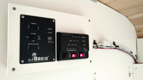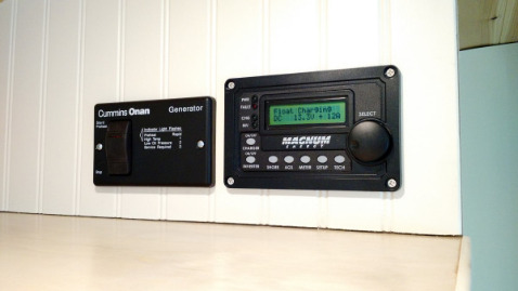 Controls for the generator and inverter/charger were mounted above the refrigerator, on the pantry wall; again one made using a single piece of plywood. So, depth was an issue, of course.