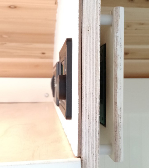 On the back side of the wall (top-left, inside the pantry), the heater remote and tank level monitor were mounted, with the necessary wires running down the back left corner of the pantry - concealed by an angled board.
