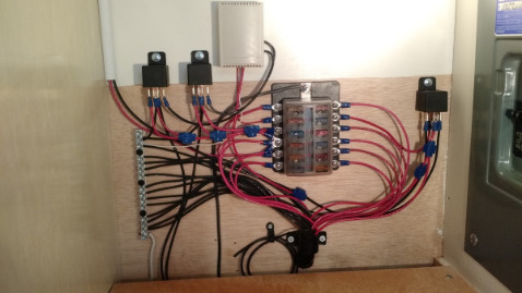 On the back wall of the closet, near the bathroom, is the rear fuse panel (shown below). About half of the 12v DC circuits are sent here. The tan box at the top of the photo is a wireless relay that controls the bay doors and the flood lights on the bus.