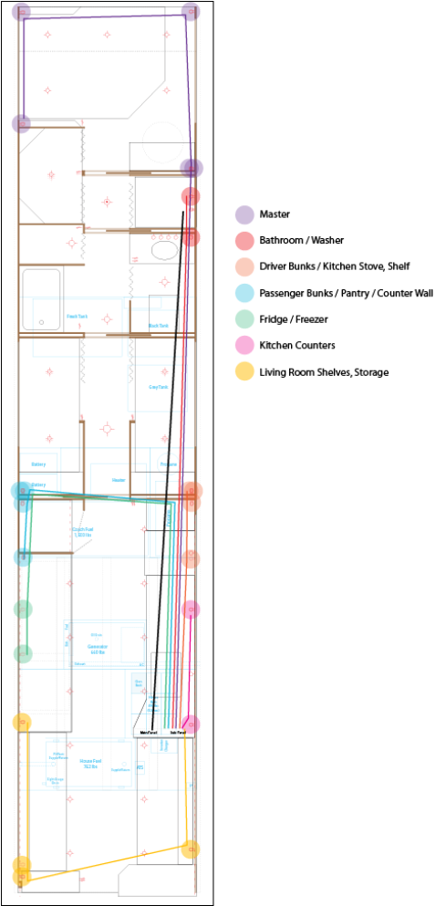 When I was finished, a few things deviated from the electrical diagram I initially made up (left or above, depending on your screen size), but it helped to try to visualize where the AC wires needed to run, and how many outlets and devices would potentially be on each circuit.