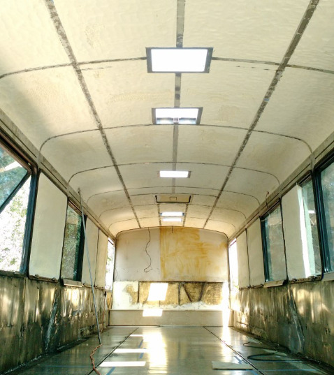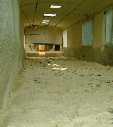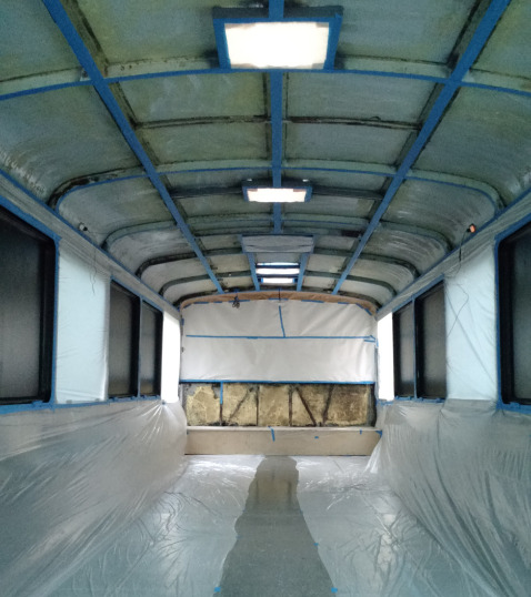 With the inside down to the frame, and the (darkened) windows ready to be covered over, it was time to mask things off.