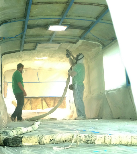The idea was to cover anything and everything that we didn't want closed-cell poly-something insulation stuck to. This included the floor, the windows we wanted to still see through, and the frame ("ribs") in the ceiling - had to be able to see those so they could be used as a depth gauge when cutting/grinding back the insulation, to have it only be as thick as the ribs in the ceiling. Covering the surface of them with blue tape saved a lot of time.