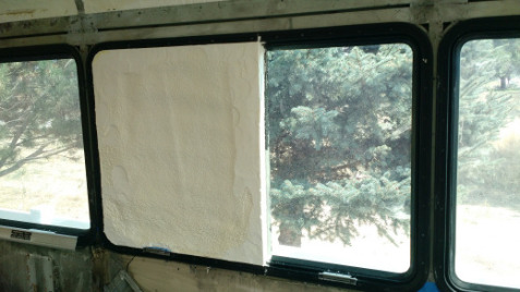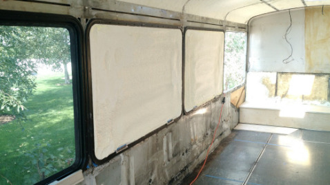 As mentioned on the Demolition page, I discovered the lower walls (beneath the windows, that had metal and fiberglass sheets over them) contained, in fact, a type of foam-board insulation, installed at the factory.