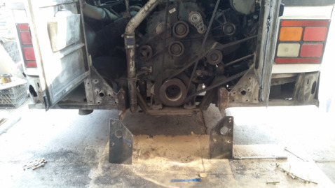 Clamps held the components together while we sandwiched the soon-to-be hitch in between the existing bumper mounting places, and (temporarily) bolted it all on again, so the parts could be adjusted and tack welded in place.