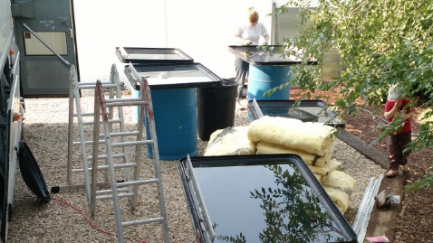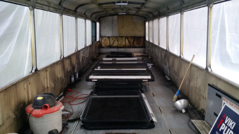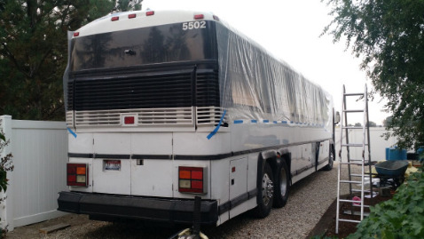 During moments of inclement weather (and also fearing that perhaps the roof wasn't as sealed as it could be) we covered the entire top and sides of the bus with heavy duty plastic (6 mil?) to keep the rain from entering the bus. This was a pain in the butt, and had me wishing for a nice, big, heated shop more than once.