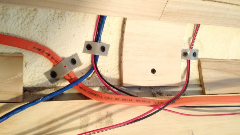 Initially wires were held in place with plastic plumber's tape and/or loose zip ties, until they could be tidied up later before wall boards were mounted.