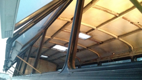 Finally finished, after about 5 hours (I'm slow, and have dull drill bits). A wiring harness that connects to the rear lights was later installed to fire in time with the bus signals.